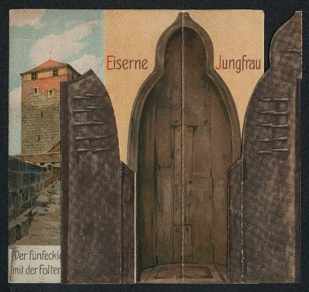 Klapp-Lithographie Eiserne Jungfrau, fünfeckiger Turm mit Folterkammer