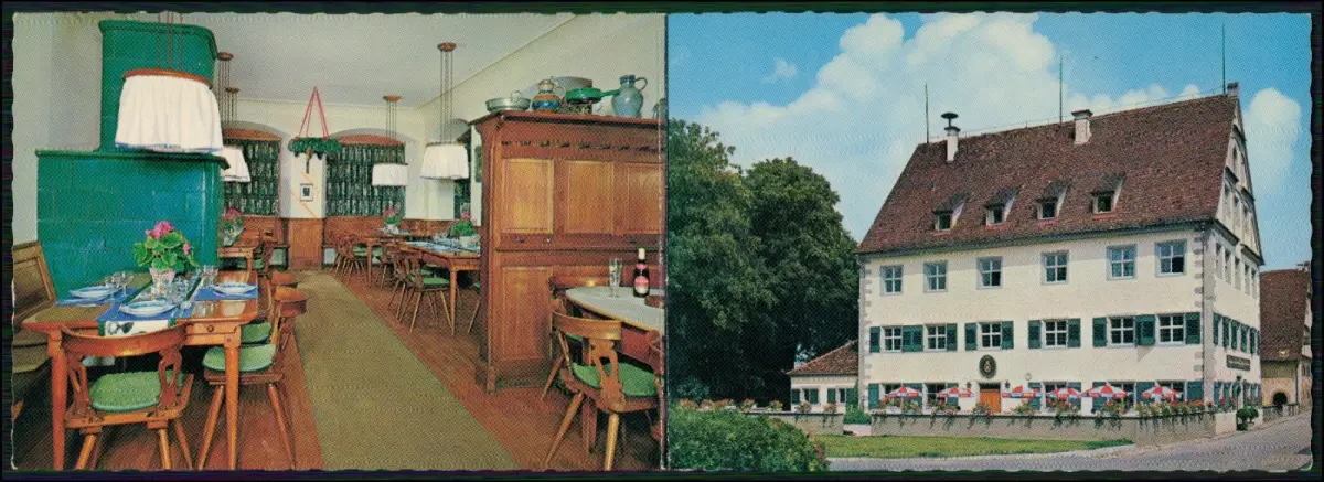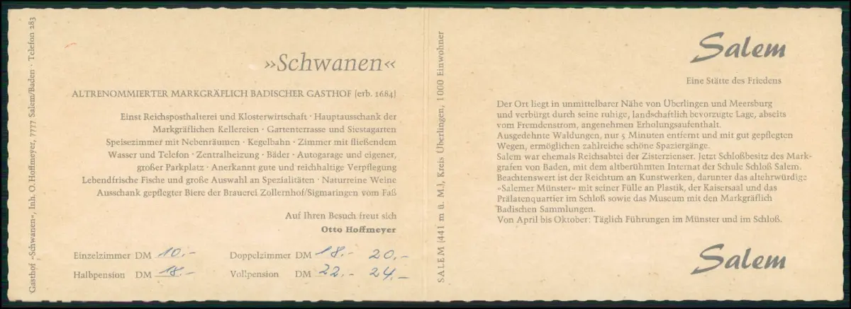 Salem Gasthof Schwanen Klappkarte Innenraum Gaststube Terrasse Baden Beschreibung der Ort rund um eine bedeutende Abtei und gehört heute zu den kulturreichen Gemeinden am Bodensee. Die Klappkarte zeigt den traditionsreichen Gasthof Schwanen (Inhaber O. Hoffmeyer) mit seiner charakteristischen Gastterrasse sowie den Innenraum der Gaststube mit regionaltypischer Einrichtung, Porzellan und markantem Kachelofen. Die Karte vermittelt eindrucksvoll das Ambiente eines klassischen badischen Gasthauses. Rückseite Zustand