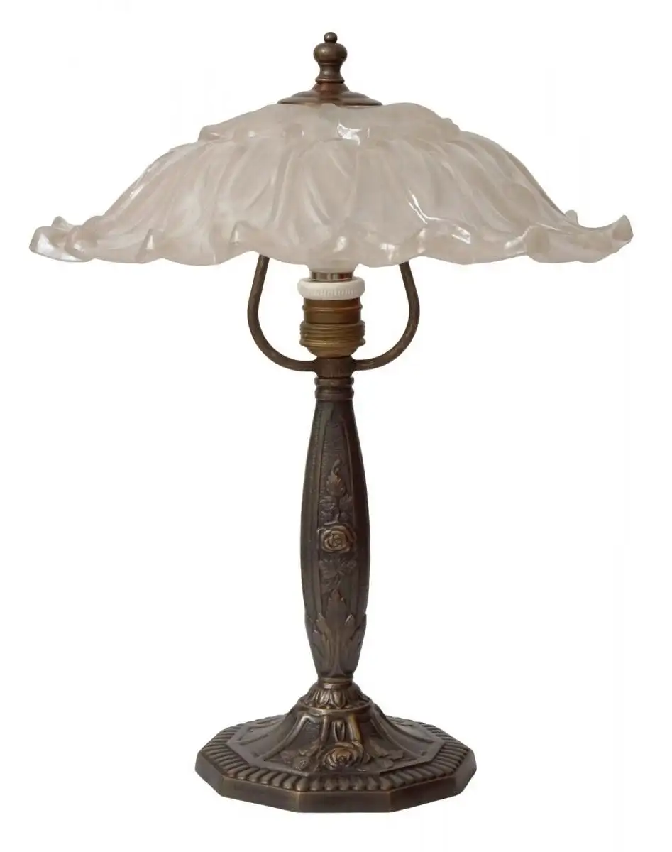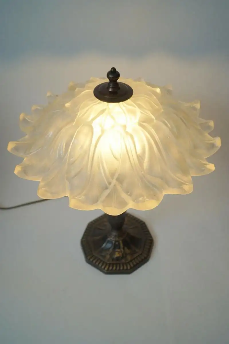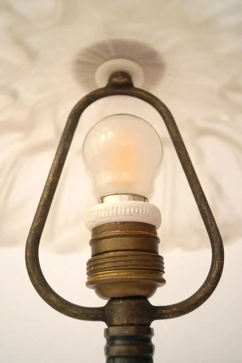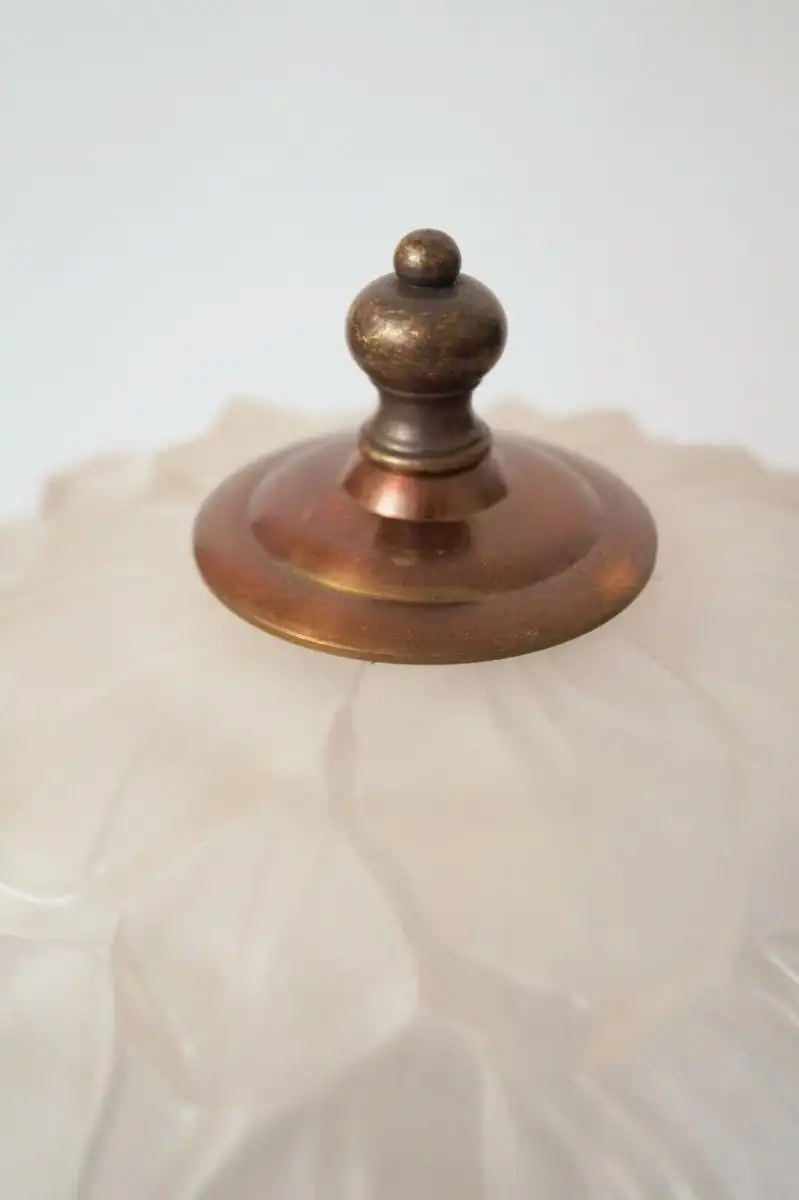 Jugendstil Art Deco Messing\nUnikat, ca. 1960er, Messing-Montur, Gesamthöhe ca. 42 cm, neue Elektrik\nWunderschöne, unikate Jugendstil/Art Deco Messinglampe. Ca. 1960er - 1970er Jahre - nicht antik - bitte beachten! Dunkelbraun patinierte Messing-Montur mit schönem Blüten-Dekor. Seltenes Jugendstil Glas, satiniert. Gesamthöhe ca. 42 cm, Gesamtbreite ca. 35 cm. Komplett erneuerte elektrische Installation. PCV-Zuleitung mit Schnur-Zwischenschalter. Antike E27 Messing-Fassung mit Porzellankragen, bis max. 40 Watt. Wir empfehlen LED-Leuchtmittel! Kleinteile wie Schrauben oder Unterlegscheiben wurden erneuert!