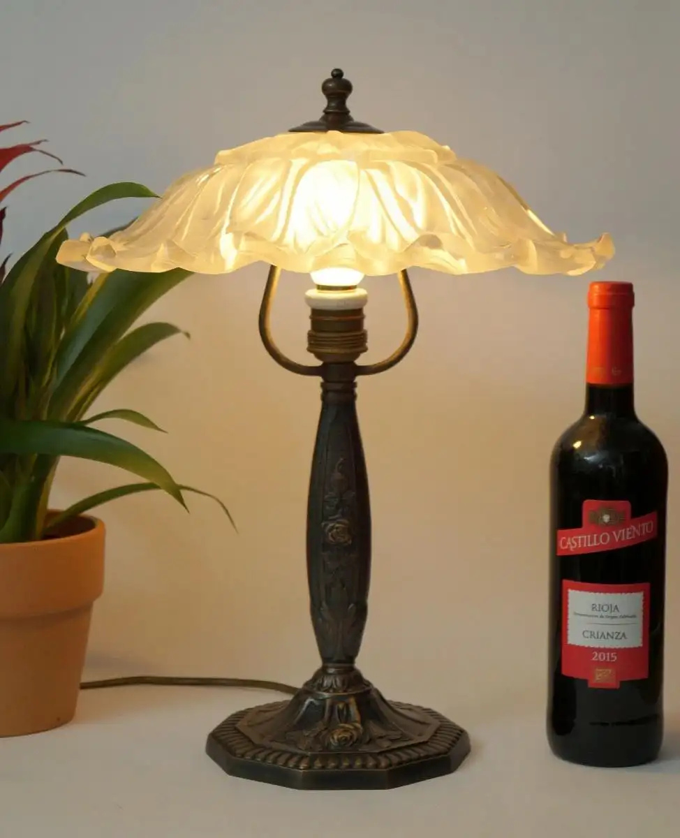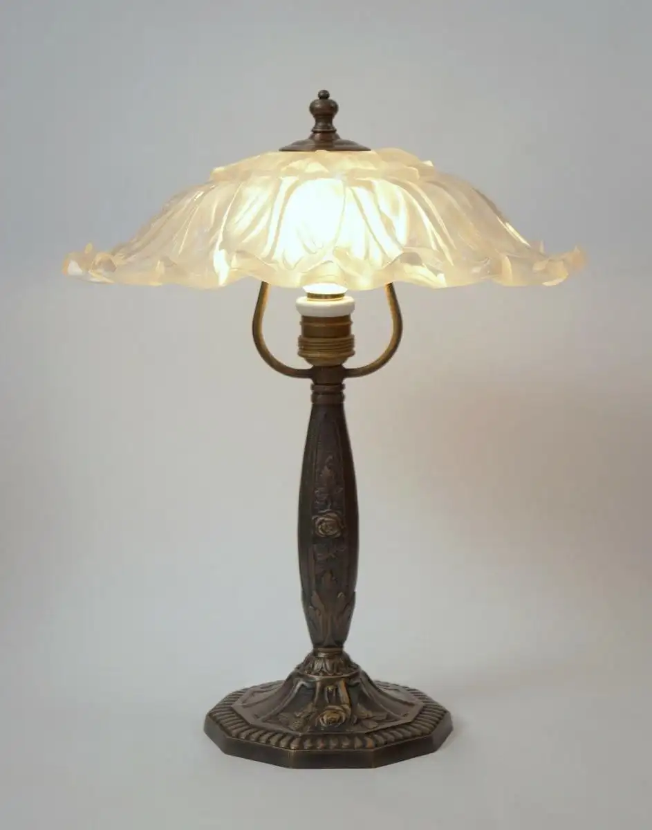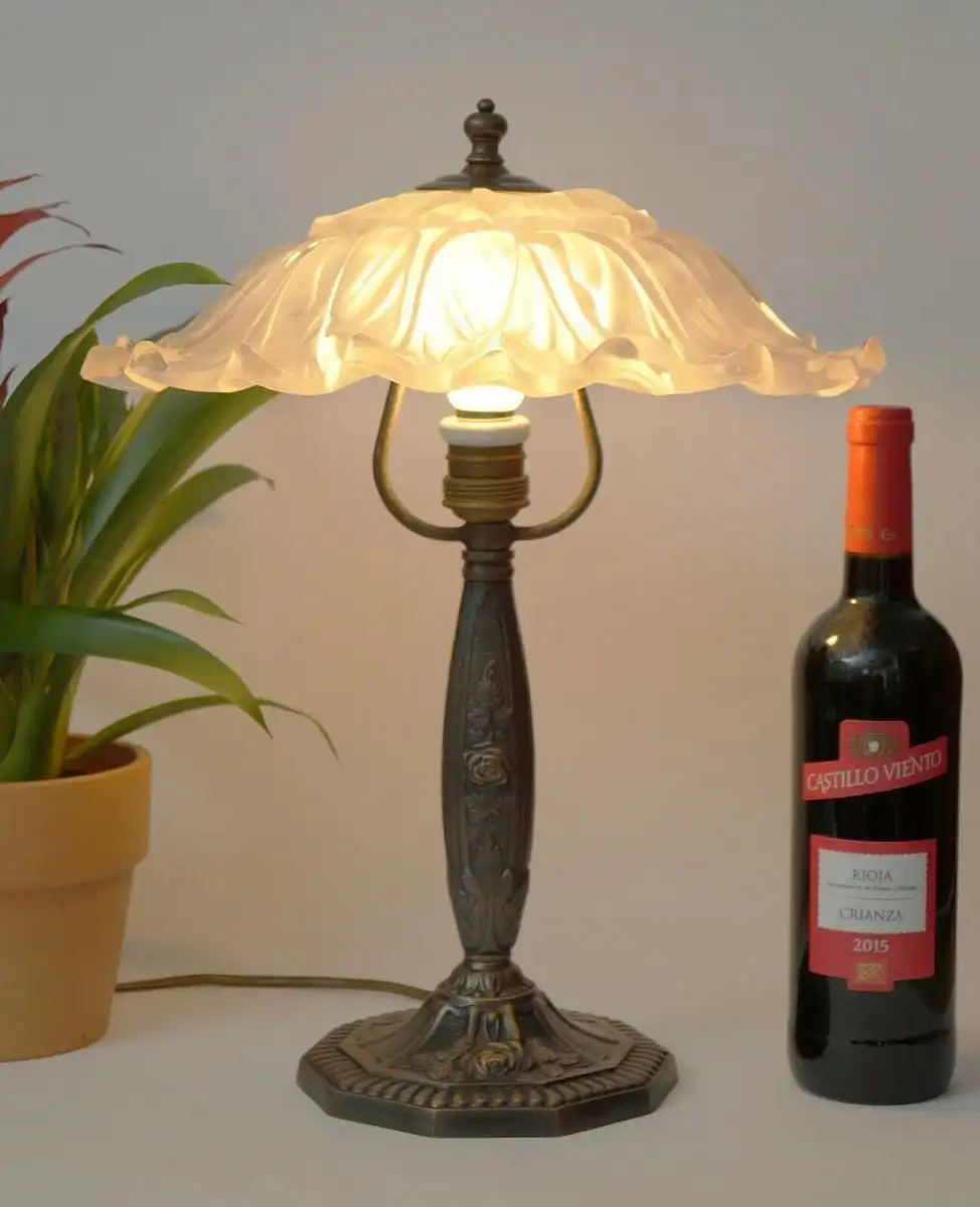 Jugendstil Art Deco Messing\nUnikat, ca. 1960er, Messing-Montur, Gesamthöhe ca. 42 cm, neue Elektrik\nWunderschöne, unikate Jugendstil/Art Deco Messinglampe. Ca. 1960er - 1970er Jahre - nicht antik - bitte beachten! Dunkelbraun patinierte Messing-Montur mit schönem Blüten-Dekor. Seltenes Jugendstil Glas, satiniert. Gesamthöhe ca. 42 cm, Gesamtbreite ca. 35 cm. Komplett erneuerte elektrische Installation. PCV-Zuleitung mit Schnur-Zwischenschalter. Antike E27 Messing-Fassung mit Porzellankragen, bis max. 40 Watt. Wir empfehlen LED-Leuchtmittel! Kleinteile wie Schrauben oder Unterlegscheiben wurden erneuert!