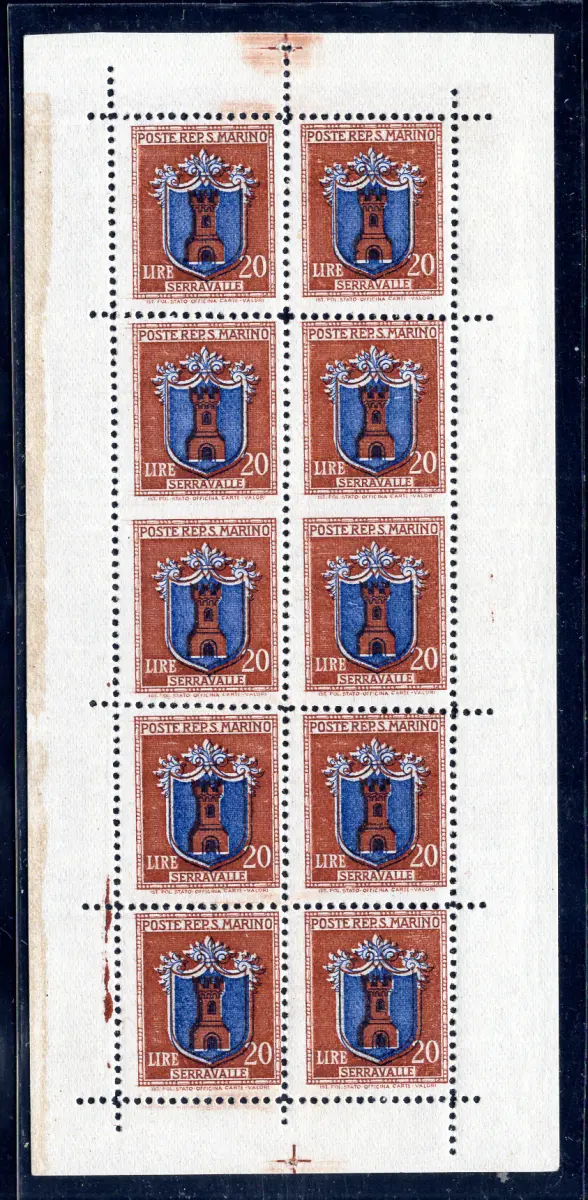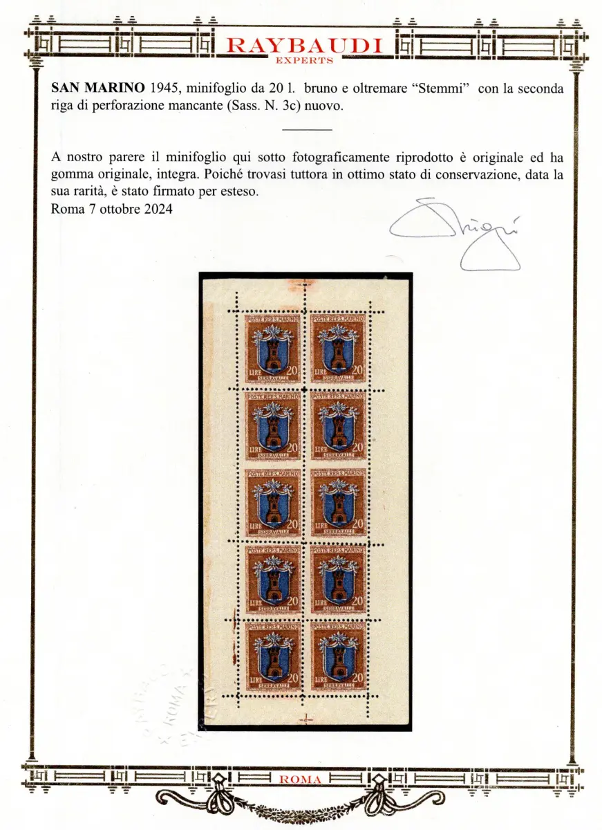 MNH - Vollgummi - - Wappen Lire 20 braun und übersee - Kleinbogen mit zehn Nr. 3c mit der fehlenden dritten Bohrlinie, die das Vorhandensein von zwei ungezahnten vertikalen Paaren in der Mitte bestimmt - sehr guter Erhaltungszustand, perfekt mit Vollgummi - Sehr selten, Raybaudi Gold zertifiziert Cod. 2487/WEB