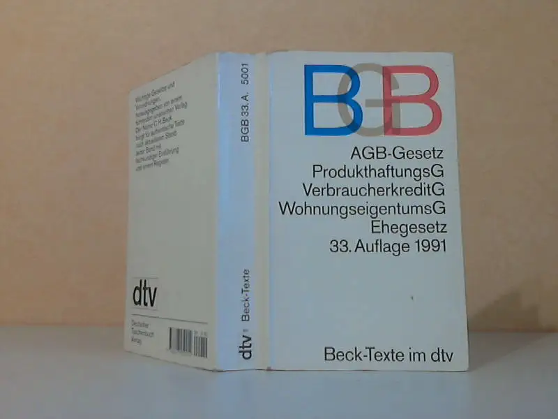 die Seiten und der Einband sind altersbedingt gebräunt, fleckig, aus dem Inhalt: Einführung von Universitätsprofessor Dr. Karl Larenz - 1. Bürgerliches Gesetzbuch vom 18. August 1896 - 2. Einfuhrungsgesetz zum Bürgerlichen Gesetzbuche vom 18. August 1896 (Auszug) - 3. Beurkundungsgesetz vom 28. August 1969 - 4. Gesetz zur Regelung des Rechts der Allgemeinen Geschäftsbe¬ dingungen (AGB-Gesetz) vom 9. Dezember 1976 - 5. Verbraucherkreditgesetz (VerbrKrG) vom 17. Dezember1990 - 5a. Gesetz über den Widerruf von Haustürgeschäften und ähnlichen Geschäften vom 16. Januar 1986 - 5 b. Gesetz über die Haftung für fehlerhafte Produkte (Produkthaftungsgesetz- ProdHaftG) vom 15. Dezember 1989 - 6. Gesetz zur Regelung der Miethöhe vom 18. Dezember 1974 - 7. Gesetz über das Wohnungseigentum und das Dauerwohnrecht (Wohnungseigentumsgesetz) vom 15. März 1951 - 8. Ehegesetz (Gesetz Nr. 16 des Kontrollrates) vom 20. Februar 1946 - 9. Verordnung zur Durchfuhrung und Ergänzung des Gesetzes zur Vereinheitlichung des Rechts der Eheschließung und der Ehescheidung (Ehegesetz) vom 27. Juli 1938 - 10. Verordnung zur Ausführung des Ehegesetzes vom 20. Februar 1946 (Kontrollratsgesetz Nr. 16) vom 12. Juli 1948 - 11. Verordnung über die Behandlung der Ehewohnung und des Hausrats (Sechste Durchführungsverordnung zum Ehegesetz) vom 21. Oktober 1944 - 12. Gesetz zur Regelung von Härten im Versorgungsausgleich vom 21. Februar 1983 - Sachverzeichnis. Beschreibung vom Antiquariat Ardelt 4a5b ISBN-Nummer: 3423050012 Antiquariat Ardelt