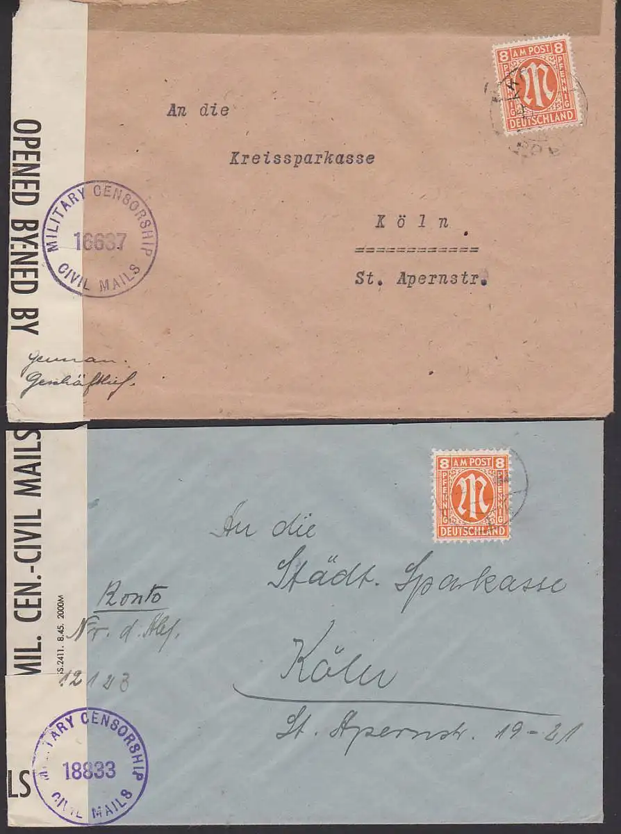 Köln mit englischer Zensur-St. 16637, 18833, je Ortsbrief, dabei engl. Druck 5.12.45(5, 14)