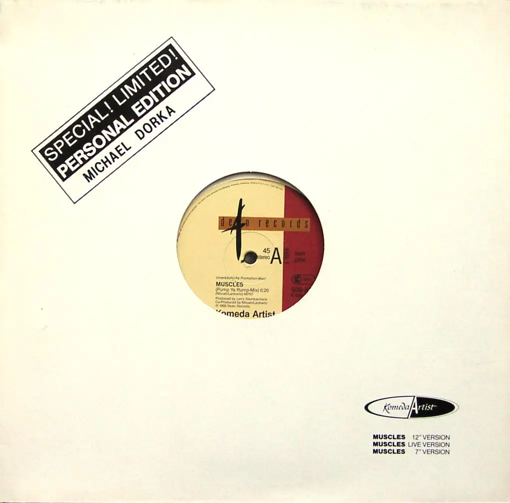 12" Maxi Komeda Artist - Muscles, Pump Ya Rump-Mix, Promo; Info, Zustand Platte M- Hülle M-; Made in Germany 1988 Dean Records 609 875, Tracks Pump Ya Rump-Mix 6:20, Live In Ankara 4:27, 7" Radio Mix 3:39