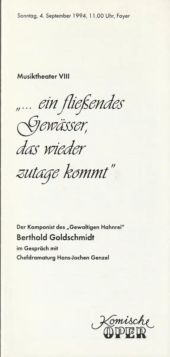 Komische Oper, Albert Kost: Programmheft MUSIKTHEATER VIII EIN FLIESS (ß)ENDES GEWÄSSER DAS WIEDER ZUTAGE KOMMT 4. September 1994 Foyer Komische Oper.