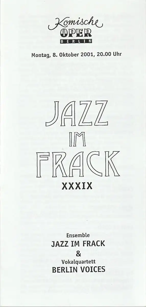 Mitwirkende: Ensemble Jazz im Frack: Esther Krombholz, Flöte / Arnold Hänsch, Trompete, Flügelhorn / Markus Behrsing, Klarinette, Saxophon / Matthias Hessel, Klavier / Thomas Koch, Kontrabass, E-Bass / Mario Würzebesser, Schlagzeug / Hartmut Behrsing, Posaune. Leitung: Hartmut Behrsing. Vokalquatett Berlin Voices: Sarah Kaiser, Esther Kaiser, Kristofer Ben und Marc Secara. Programm: Kompositionen von George Gershwin, Darmon Meader, Burton Lane, Alan Jay Lerner, Duke Elington, Markus Behrsing, Hartmut Behrsing, u. a. - Theaterprogramm, Opernprogramm, Ballettprogramm, Musicalprogramm, Konzertprogramm, Theatermemorabilia, Programmhefte Sammlung, deutsche Theatergeschichte.
