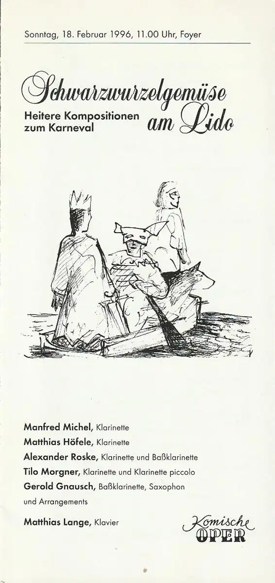 Heitere Kompositionen zum Karneval. Mitwirkende: Manfred Michel, Klarinette / Matthias Höfele, Klarinette / Alexander Roske, Klarinette und Baßklarinette / Tilo Morgner, Klarinette und Klarinette piccolo / Gerold Gnausch, Baßklarinette, Saxophon und Arrangements / Matthias Lange Klavier. Programm: 10 heitere Kompositionen von Alamiro Giampieri, Fritz Kröpsch, Maurice C. Whitney, Adolf Schreiner, Georg Schade, u. a. - Theaterprogramm, Opernprogramm, Ballettprogramm, Musicalprogramm, Konzertprogramm, Theatermemorabilia, Programmhefte Sammlung, deutsche Theatergeschichte.