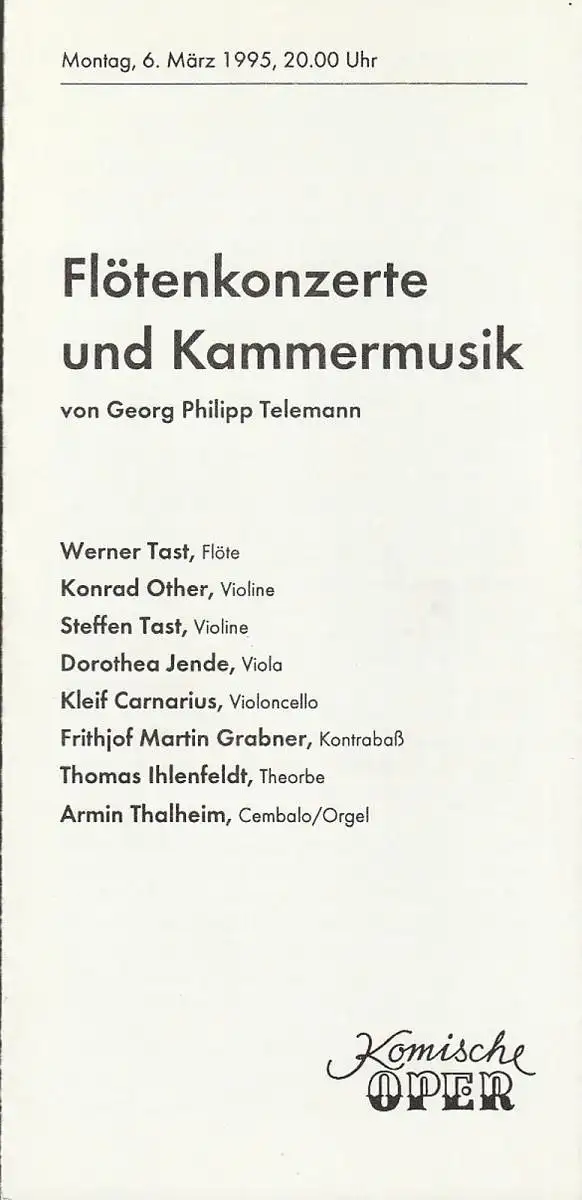 Titel: Programmheft FLÖTENKONZERTE UND KAMMERMUSIK von Georg Philipp Telemann 6. März 1995 Komische Oper Spielzeit 1994 / 95