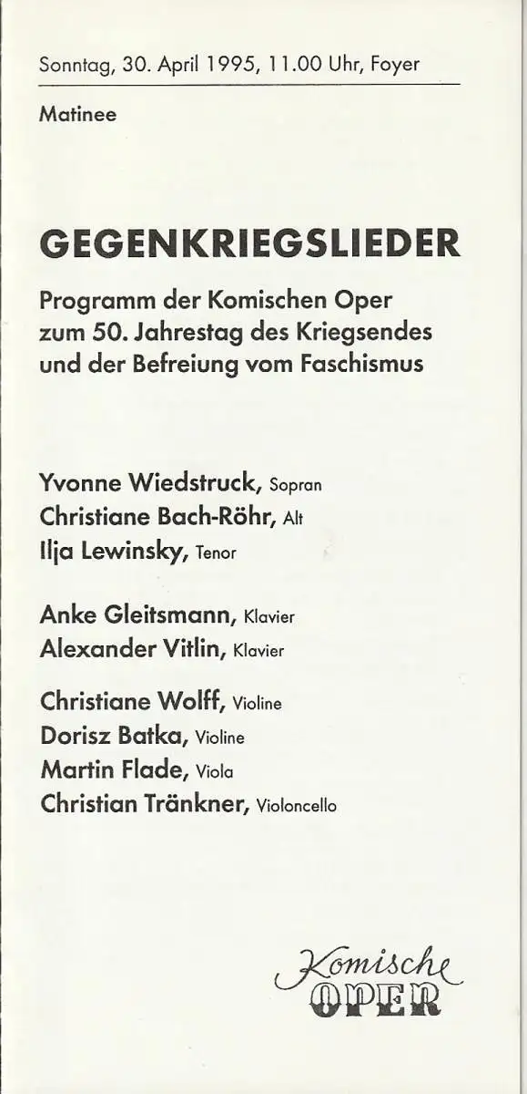 Programm der Komischen Oper zum 50. Jahrestag des Kiegsendes und der Befreiung vom Faschismus. Mitwirkende: Yvonne Wiedstruck, Sopran / Christiane Bach-Röhr, Alt / Ilja Lewinsky, Tenor / Anke Gleitsmann, Klavier / Alexander Vitlin, Klavier / Christiane Wolff und Dorisz Batka, Violine / Martin Flade, Viola / Christian Tränkner, Violoncello. Programm: Werke von Paul Dessau, Hanns Eisler und Dmitri Schostakowitsch - Theaterprogramm, Opernprogramm, Ballettprogramm, Musicalprogramm, Konzertprogramm, Theatermemorabilia, Programmhefte Sammlung, deutsche Theatergeschichte.