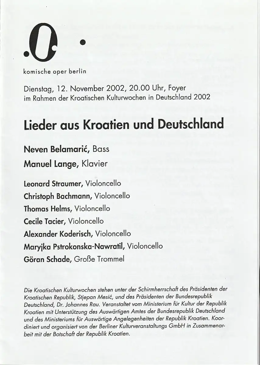 Im Rahmen der Kroatischen Kulturwochen in Deutschland 2022. Mitwirkende: Neven Belamaric, Bass / Manuel Lange, Klavier. Leonard Straumer, Christoph Bachmann, Thomas Helms / Cecilie Tacier, Alexander Koderisch, Maryjka Pstrokonska-Nawratil, Violoncello / Göran Schade, Große Trommel. Programm: ROBERT SCHUMANN: Drei Balladen. CARL LOEWE: Drei Balladen. KRESIMIR BARANOVIC: Liederzyklus Moj grad - Meine Stadt. JAKOV GOTOVAC: Bor - Der Föhrenbaum op. 26,5. Na nocistu - In der Herberge op. 4,2. IGOR KULJERIC: Uraufführung Otce bas - Vater unser im Himmel Glagolitisches altkroatisches Gebet. MILKO KELEMEN: Komposition nch Texten von Walt Whitman für Sprecher, 6 Violoncelli, Große Trommel und 4 Scheinwerfer - Theaterprogramm, Opernprogramm, Ballettprogramm, Musicalprogramm, Konzertprogramm, Theatermemorabilia, Programmhefte Sammlung, deutsche Theatergeschichte.