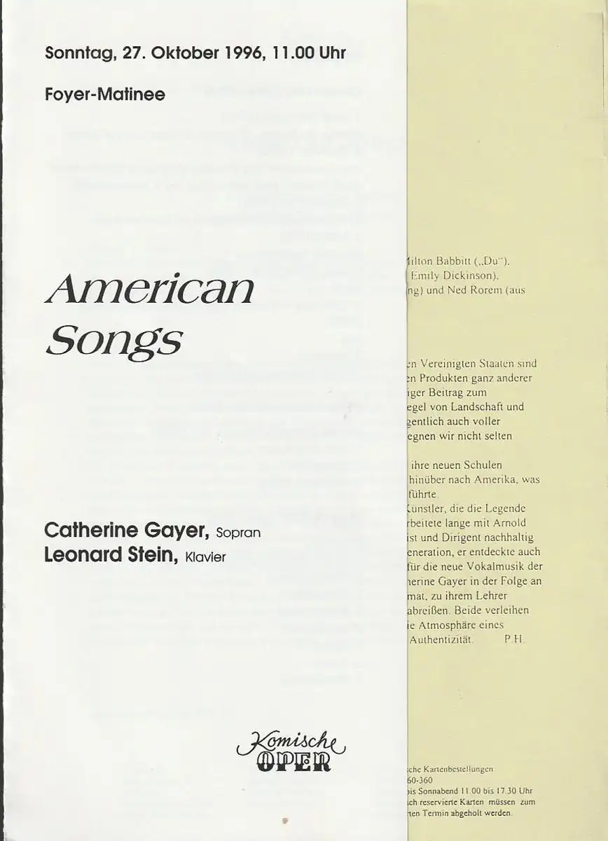 Titel: Programmheft AMERICAN SONGS CATHERINE GAYER / LEONARD STEIN 27. Oktober 1996 Foyer-Matinee Komische Oper Spielzeit 1996 / 97