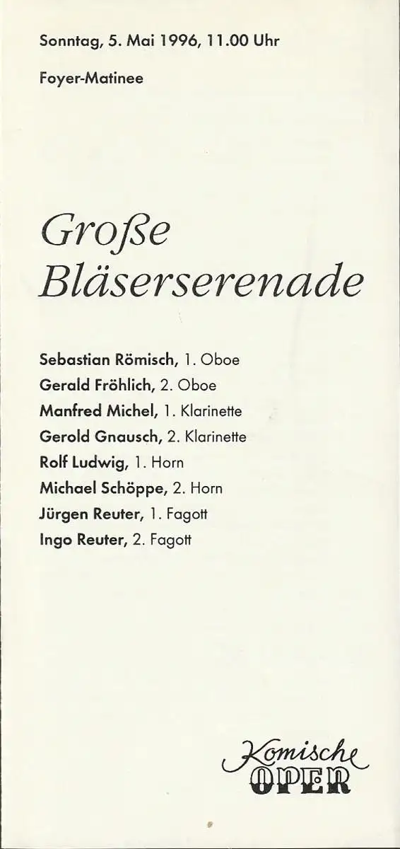 Komische Oper Berlin, Albert Kost, Peter Huth: Programmheft GROSS(ß)E BLÄSERSERENADE 5. Mai 1996 Foyer - Matinee Komische Oper Spielzeit 1995 / 96.