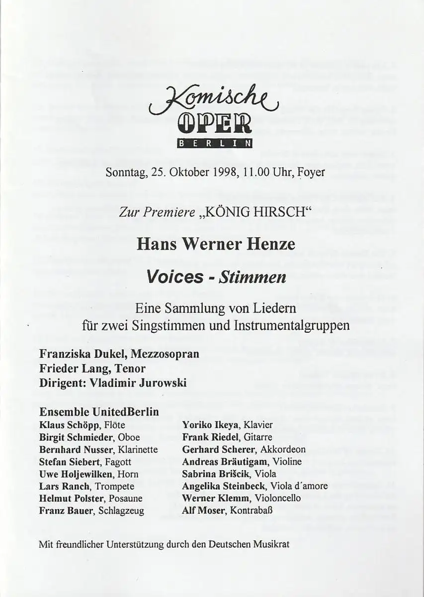 Titel: Programmheft Zur Pemiere KÖNIG HIRSCH HANS WERNER HENZE VOICES - STIMMEN 25. Oktober 1998 Foyer Komische Oper Spielzeit 1998 / 99