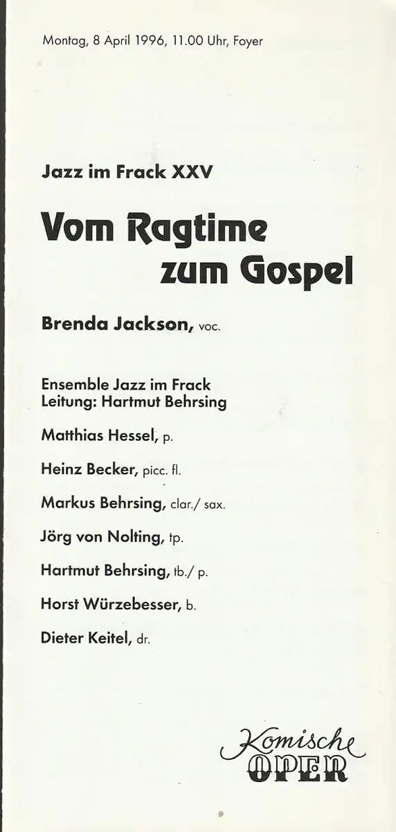 Titel: Programmheft JAZZ IM FRACK XXV VOM RAGTIME ZUM GOSPEL BRENDA JACKSON 8. April 1996 Foyer Komische Oper Spielzeit 1995 / 96