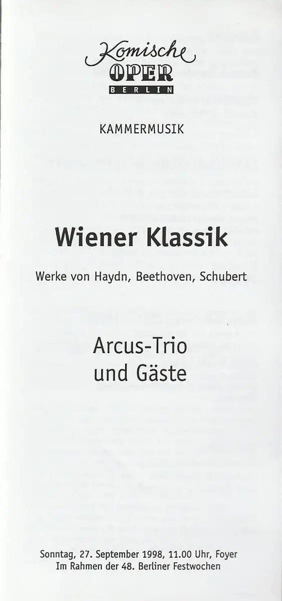 Titel: Programmheft WIENER KLASSIK WERKE VON HAYDN, BEETHOVEN, SCHUBERT ARCUS-TRIO UND GÄSTE 27. September 1998 Foyer Komische Oper Spielzeit 1998 / 99