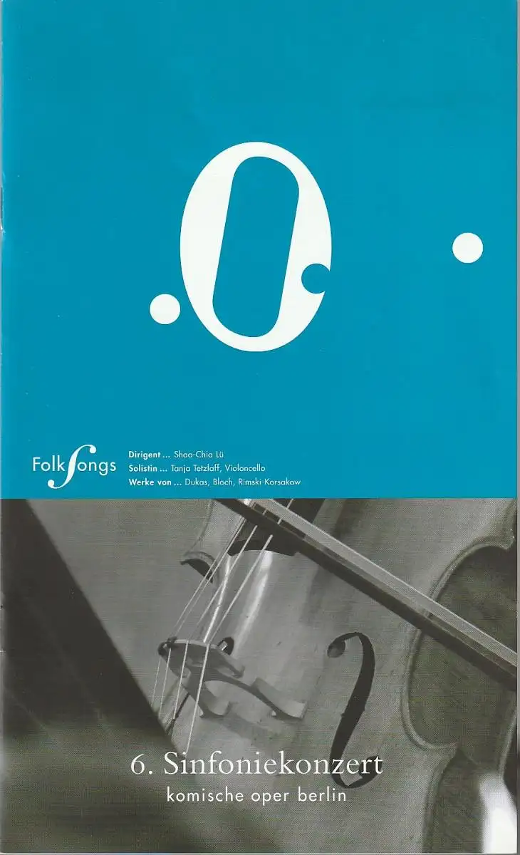 Dirigent: Shao-Chia Lü. Solist: Tanja Tetzlaff, Violoncello. Orchester der Komischen Oper. Programm: Paul Dukas: Fanfare / La Peri / Ernest Bloch: Schelomo. Hebräische Rhapsodie für Violoncello solo und großes Orchester / Nikolai Adrejewitsch Rimski-Korsakow: Scheherazade. Suite symphonique op. 35 - Theaterprogramm, Opernprogramm, Ballettprogramm, Musicalprogramm, Konzertprogramm, Theatermemorabilia, Programmhefte Sammlung, deutsche Theatergeschichte.