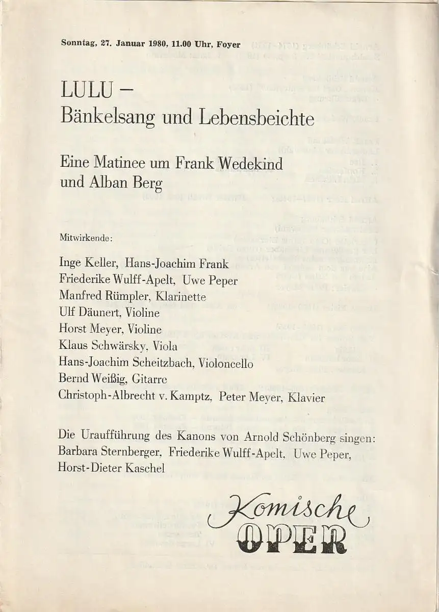 Mitwirkende: Inge Keller, Hans-Joachim Frank, Friederike Wulff-Apelt, Uwe Peper. Manfred Rümpler, Klarinette / Ulf Däunert, Violine / Hprst Meyer, Violine / Klaus Schwärsky, Viola / Hans-Joachim Scheitzbach, Violoncello / Bernd Weißig, Gitarre, Christoph-Albrecht von Kamptz, Peter Meyer, Klavier. Die Uraufführung des Kanons von Arnold Schönberg singen: Barbara Sternberger, Friederike Wulff-Apelt, Uwe Peper, Horst-Dieter Kaschel. Programm: ARNOLD SCHÖNBERG: Streichquartett Nr. 3 op. 30. Uraufführung Kanon Darf ich eintreten. Fünf Brettl-Lieder. FRANK WEDEKIND: Fünf Lautenlieder. HANNS EISLER: Von Alter und Neuer Musik. ALBAN BERG: Vier Stücke für Klarinette und Klavier. Fünf Lieder. Lyrische Suite für Streichquartett. U. a. - Theaterprogramm, Opernprogramm, Ballettprogramm, Musicalprogramm, Konzertprogramm, Theatermemorabilia, Programmhefte Sammlung, deutsche Theatergeschichte.