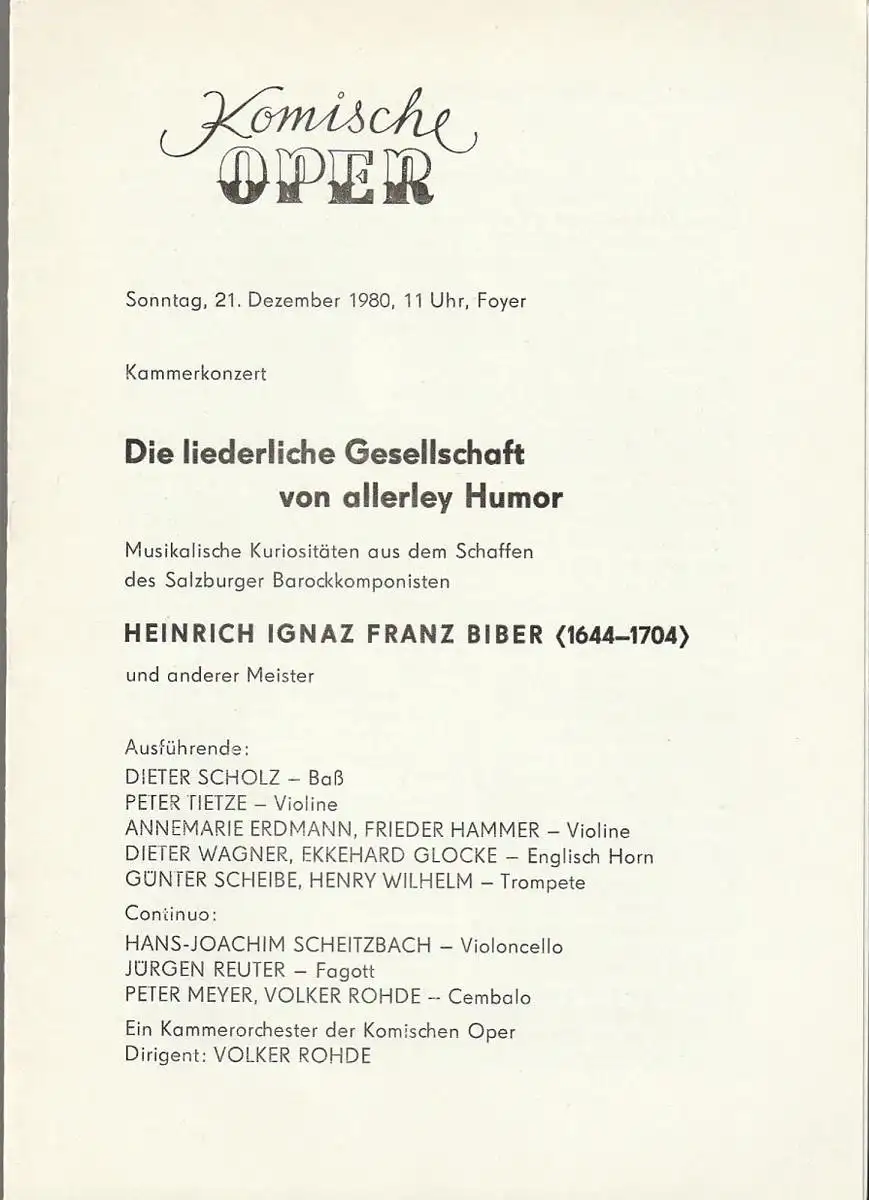 Musikalische Kuriositäten aus dem Schaffen des Salzburger Barockkomponisten Heinrich Ignaz Franz Biber und anderer Meister. Dirigent: Volker Rohde - Theaterprogramm, Opernprogramm, Ballettprogramm, Musicalprogramm, Konzertprogramm, Theatermemorabilia, Programmhefte Sammlung, deutsche Theatergeschichte.