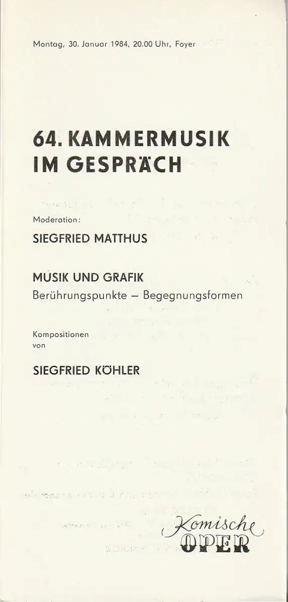 Komische Oper Berlin, G. Müller: Programmheft 64. KAMMERMUSIK IM GESPRÄCH MUSIK UND GRAFIK Kompositionen von SIEGFRIED KÖHLER 30. Januar 1984 Foyer Komische Oper Spielzeit 1983 / 84.