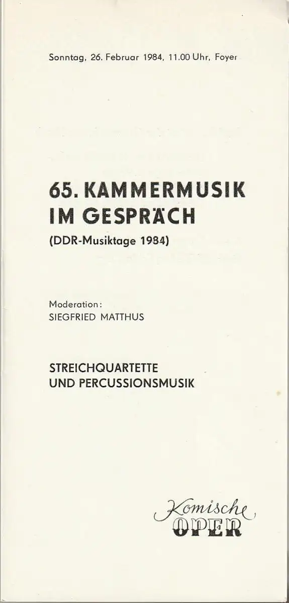 Titel: Programmheft 65. KAMMERMUSIK IM GESPRÄCH STREICHQUARTETTE UND PERCUSSIONSMUSIK 26. Februar 1984 Foyer Komische Oper Spielzeit 1983 / 84 ( DDR-Musiktage 1984 )