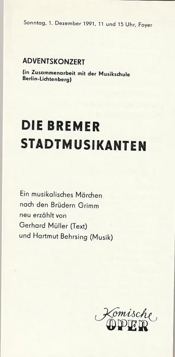 Komische Oper Berlin, G. Müller: Programmheft ADVENTSKONZERT DIE BREMER STADTMUSIKANTEN 1. Dezember 1991 Foyer Komische Oper Spielzeit 1991 / 92.