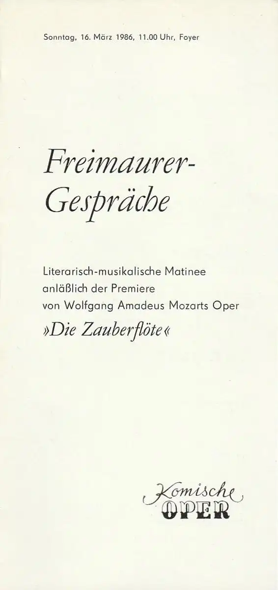 Komische Oper Berlin, G. Müller: Programmheft FREIMAURERGESPRÄCHE 16. März 1986.