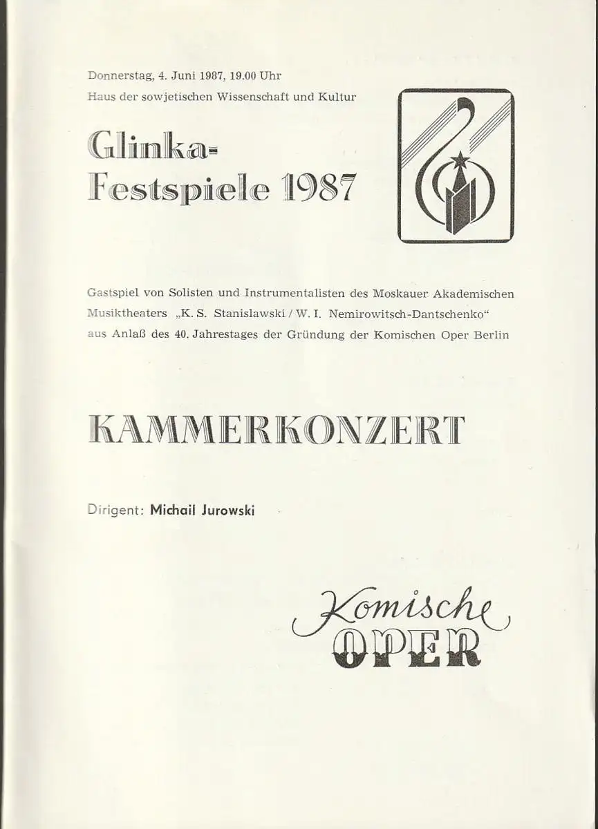 Komische Oper Berlin, G. Müller: Programmheft GLINKA- FESTSPIELE 1987 KAMMERKONZERT 4. Juni 1987 Haus der sowjetischen Wissenschaft und Kultur.