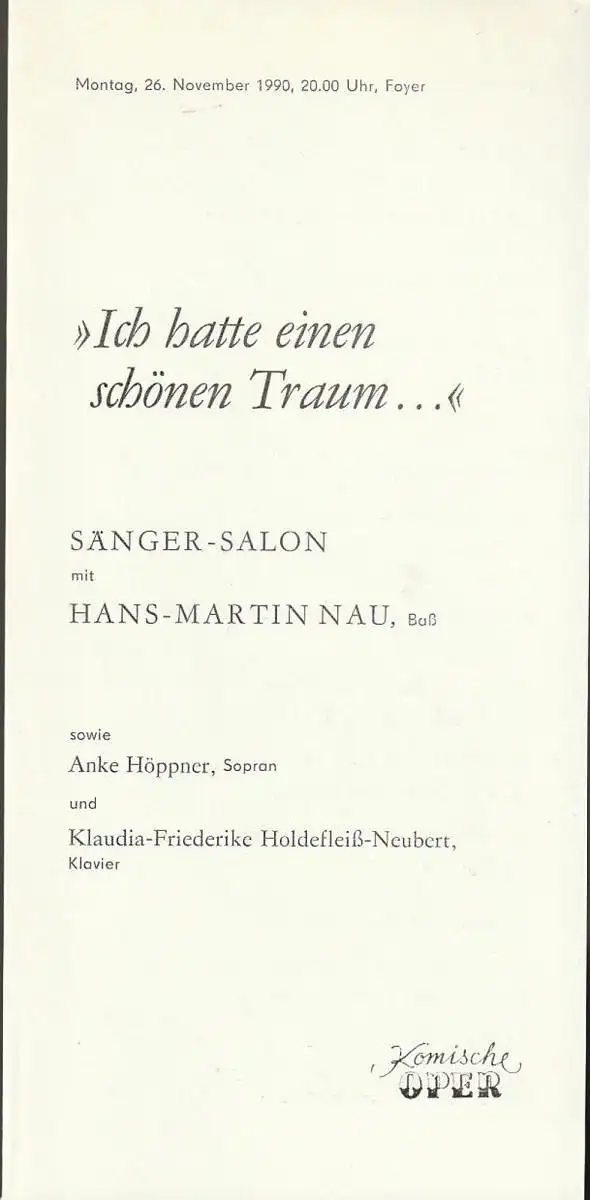 Komische Oper Berlin, G. Müller: Programmheft ICH HATTE EINEN SCHÖNEN TRAUM SÄNGER-SALON mit HANS-MARTIN NAU 26. November 1990 Foyer Komische Oper Berlin Spielzeit 1990 / 91.