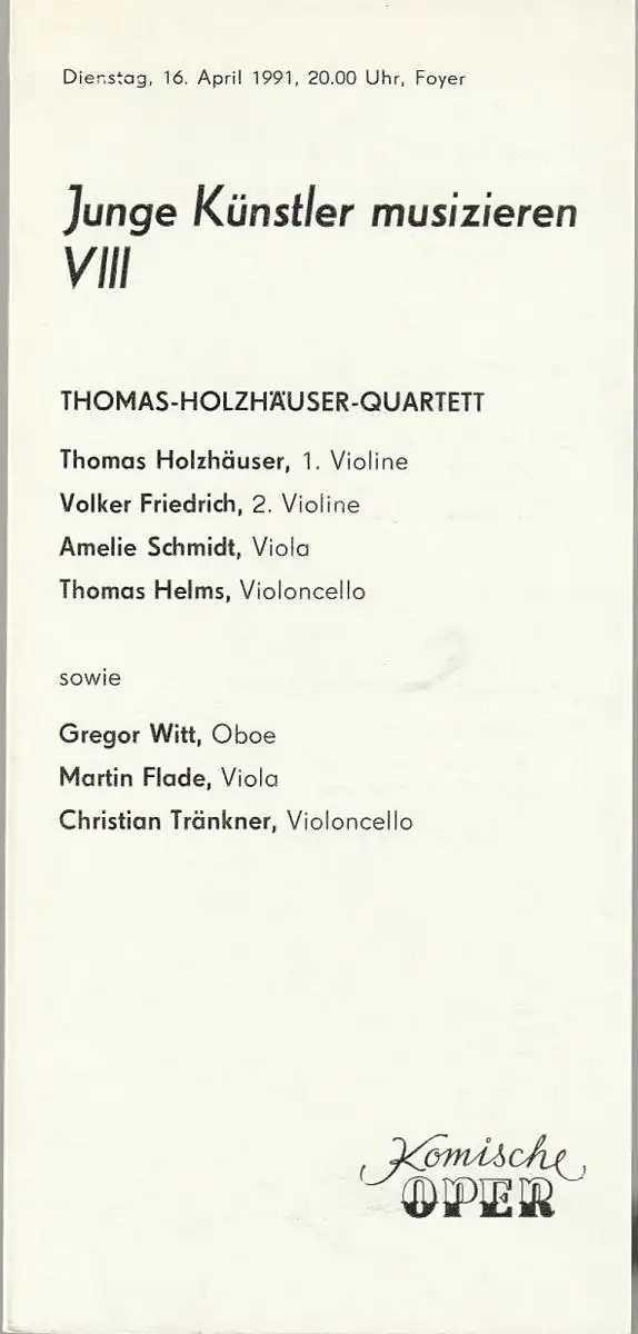 Komische Oper Berlin, G. Müller: Programmheft JUNGE KÜNSTLER MUSIZIEREN VIII 16. April 1991 Foyer Komische Oper Spielzeit 1990 / 91.