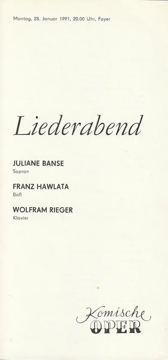 Komische Oper Berlin, G. Müller: Programmheft LIEDERABEND JULIANE BANSE / FRANZ HAWLATA / WOLFRAM RIEGER 28. Januar 1991 Foyer Komische Oper Spielzeit 1990 / 91.