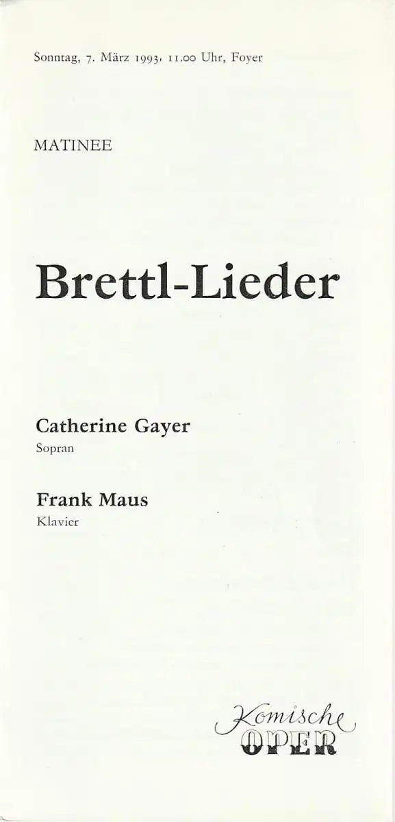 Komische Oper Berlin, G. Müller: Programmheft MATINEE BRETTL - LIEDER CATHERINE GAYER Sopran / FRANK MAUS Klavier 7. März 1993 Foyer Komische Oper.