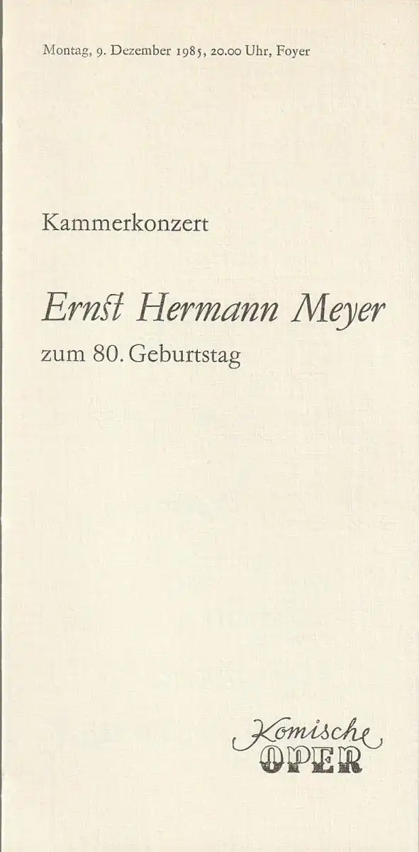 Komische Oper Berlin, Gerhard Müller, Frank Schneider: Programmheft KAMMERKONZERT ERNST HERMANN MEYER ZUM 80. GEBURTSTAG 9. Dezember 1985.