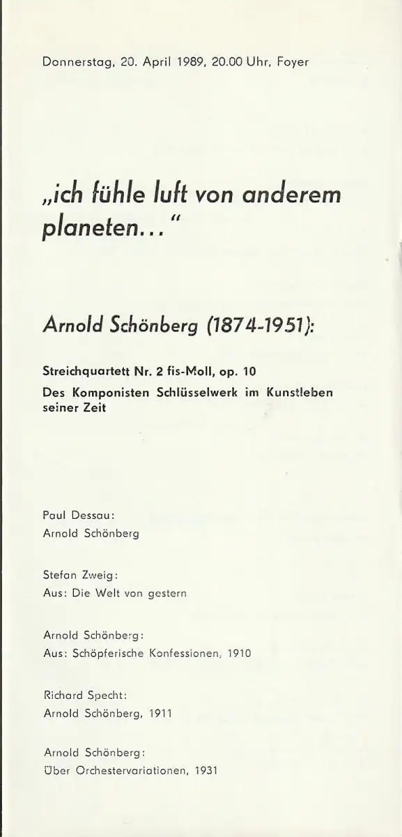 Titel: Programmheft Arnold Schönberg ICH FÜHLE LUFT VON ANDEREM PLANETEN 20. April 1989 Foyer Komische Oper Spielzeit 1988 / 89