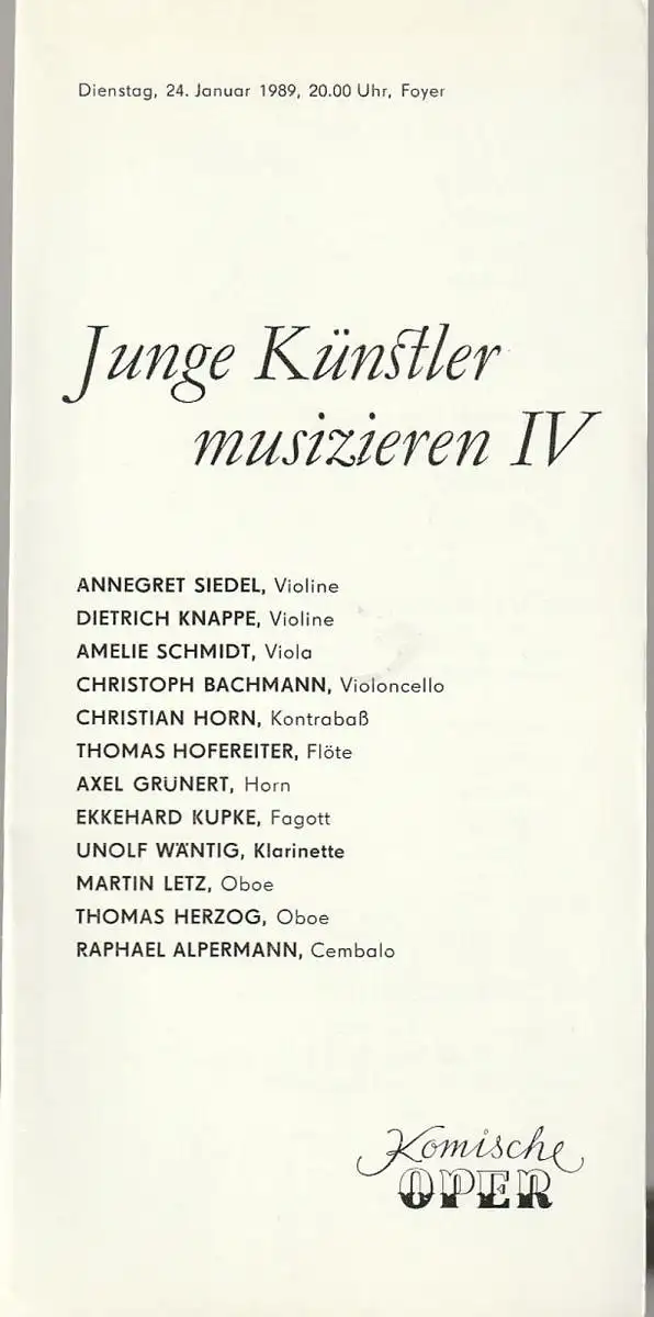 Titel: Programmheft JUNGE KÜNSTLER MUSIZIEREN IV 24. Januar 1989 Foyer Komische Oper Spielzeit 1988 / 89