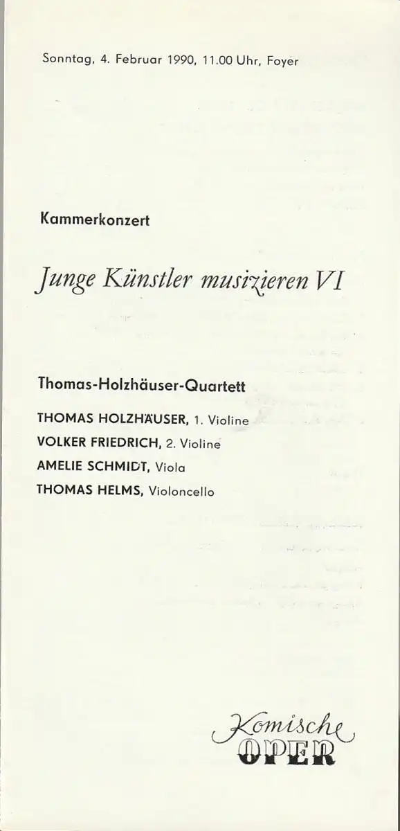 Komische Oper Berlin, Gerhard Müller: Programmheft KAMMERKONZERT JUNGE KÜNSTLER MUSIZIEREN VI 4. Februar 1990 Foyer Komische Oper Spielzeit 1989 / 90.