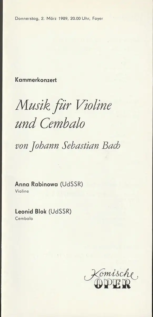 Mitwirkende: Anna Rabinowa, Violine / Leonid Blok, Cembalo. Programm: Partita d-Moll, BWV 1004, für Violine Solo. Sonate für Violine und Cembalo Nr. 1 h-Moll, BWV 1024. Sonate für Violine und Cembalo Nr. 2 A-Dur, BWV 1015. Sonate für Violine und Cembalo Nr. 3 E-Dur, BWV 1016. - Schlüsselwörter: Theaterprogramm, Opernprogramm, Ballettprogramm, Musicalprogramm, Konzertprogramm, Theatermemorabilia, Programmhefte Sammlung, deutsche Theatergeschichte.
