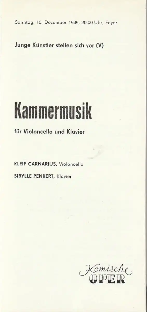 Titel: Programmheft KAMMERMUSIK FÜR VIOLONCELLO UND KLAVIER Junge Künstler stellen sich vor ( V ) 10. Dezember 1989 Foyer Komische Oper Spielzeit 1989 / 90