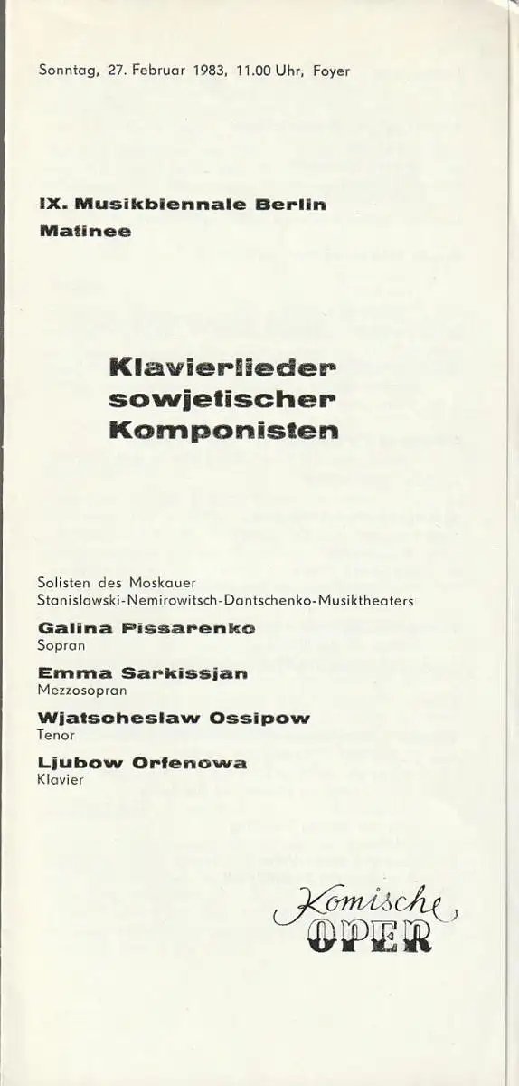 Titel: Programmheft KLAVIERLIEDER SOWJETISCHER KOMPONISTEN 27. Februar 1983 Foyer Komische Oper Spielzeit 1982 / 83 IX. Musikbiennale Berlin Matinee