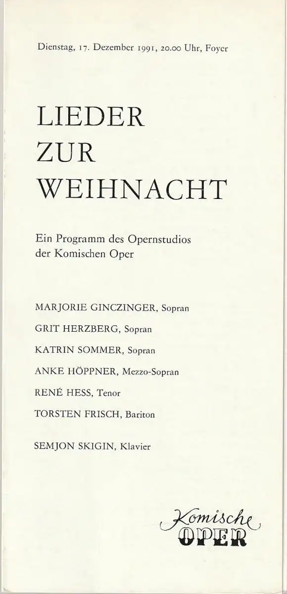 Titel: Programmheft LIEDER ZUR WEIHNACHT 17. Dezember 1991 Foyer Komische Oper Spielzeit 1991 / 92