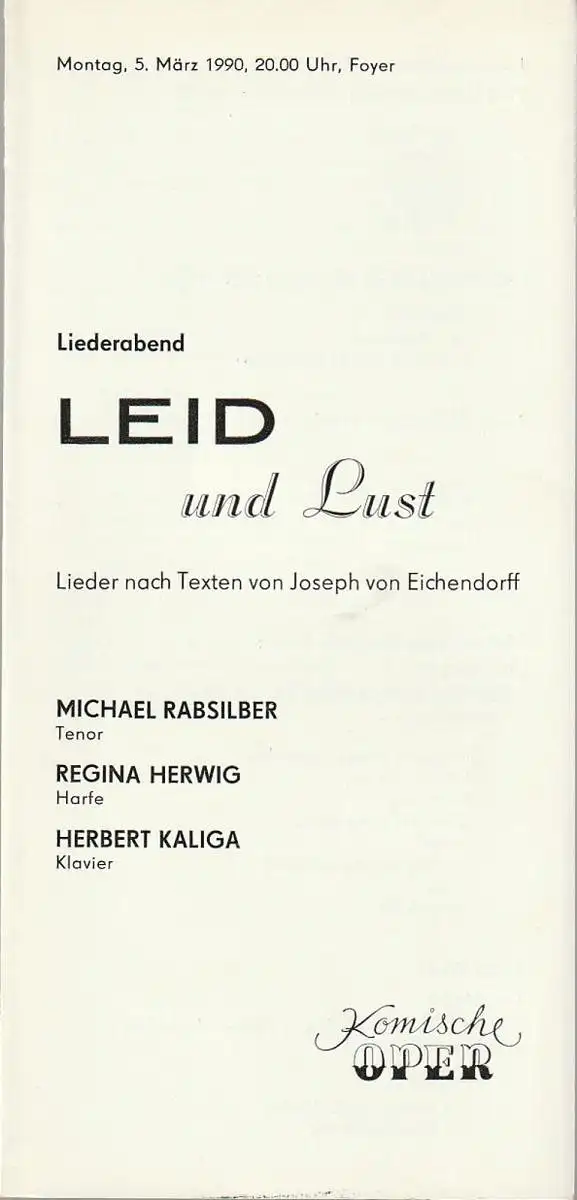Titel: Programmheft LIEDERABED LEID UND LUST 5. März 1990 Foyer Komische Oper Spielzeit 1989 / 90