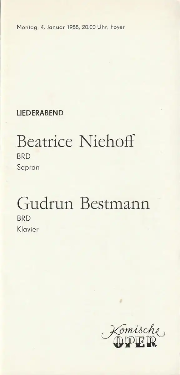 Komische Oper Berlin, Gerhard Müller: Programmheft LIEDERABEND BEATRICE NIEHOFF Sopran / GUDRUN BESTMANN Klavier 4. Januar 1988 Foyer Komische Oper Spielzeit 1987 / 88.