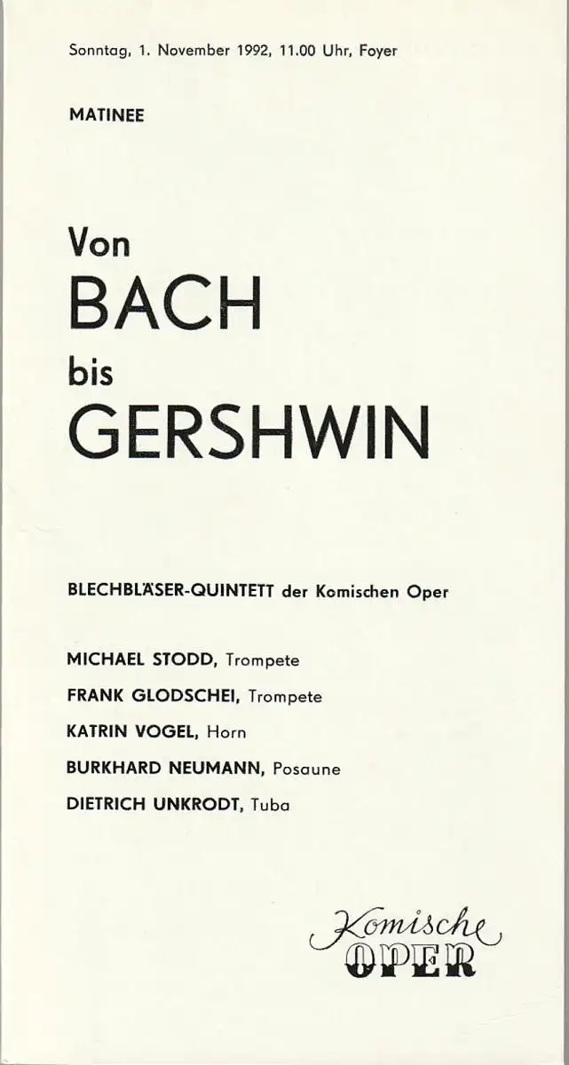 Komische Oper Berlin, Gerhard Müller: Programmheft MATINEE VON BACH BIS GERSHWIN 1. November 1992 Foyer Komische Oper.