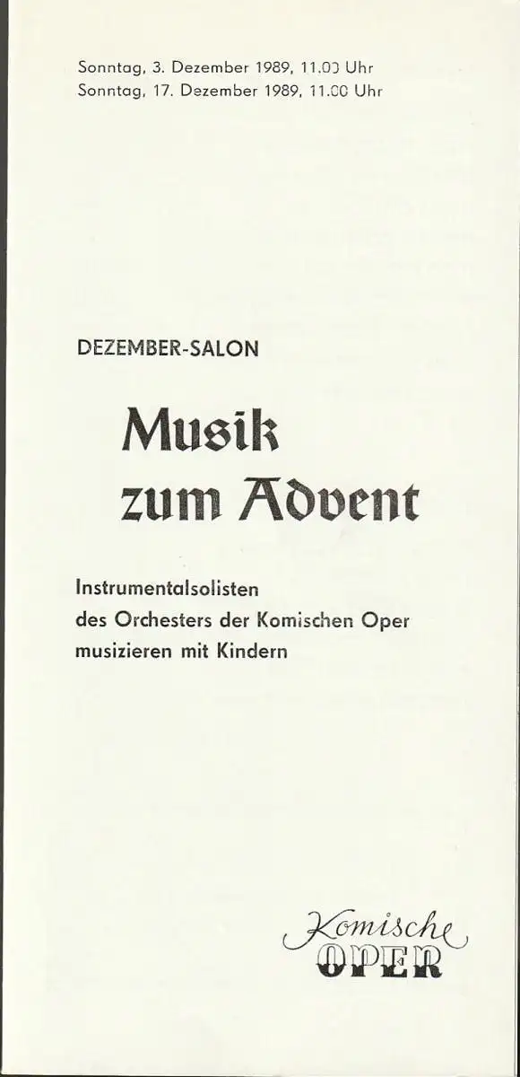Komische Oper Berlin, Gerhard Müller: Programmheft MUSIK ZUM ADVENT Dezember-Salon Komische Oper Berlin 3. + 17. Dezember 1989 Foyer Spielzeit 1989 / 90.