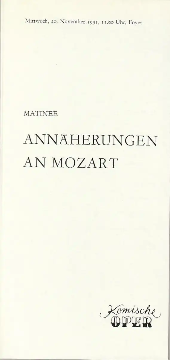 Titel: Programmheft Matinee ANNÄHERUNGEN AN MOZART 20. Novembee 1991 Foyer Komische Oper Spielzeit 1991 / 92