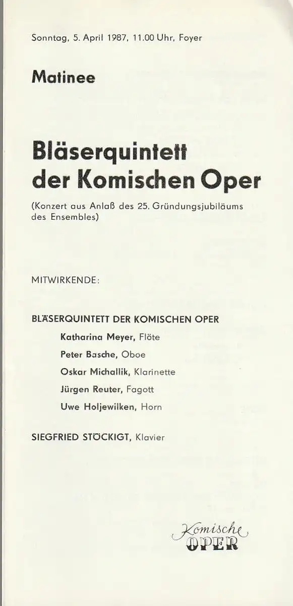 Komische Oper Berlin, Gerhard Müller: Programmheft Matinee BLÄSERQUINTETT DER KOMISCHEN OPER 5. April 1987 Foyer Komische Oper Spielzeit 1986 / 87.