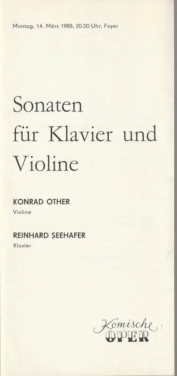 Titel: Programmheft SONATEN FÜR KLAVIER UND VIOLINE KONRAD OTHER/ REINHARD SEEHAFER 14. März 1988 Foyer Komische Oper Spielzeit 1987 / 88