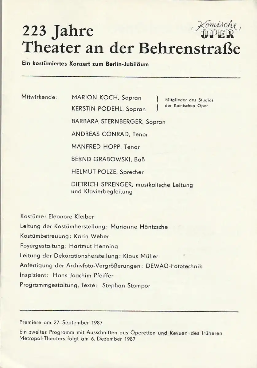Komische Oper Berlin: Programmheft 223 JAHRE THEATER AN DER BEHRENSTRAßE Premiere 27. September 1987.