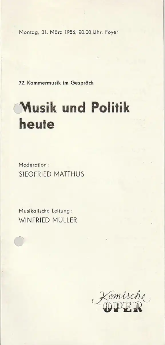 Komische Oper Berlin: Programmheft 72. KAMMERMUSIK IM GESPRÄCH 31. März 1986 Foyer Komische Oper Spielzeit 1985 / 86.