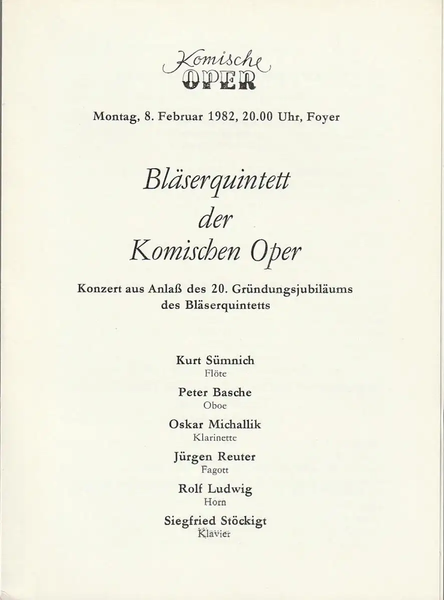 Komische Oper Berlin: Programmheft BLÄSERQUINTETT DER KOMISCHEN OPER 8. Februar 1982.