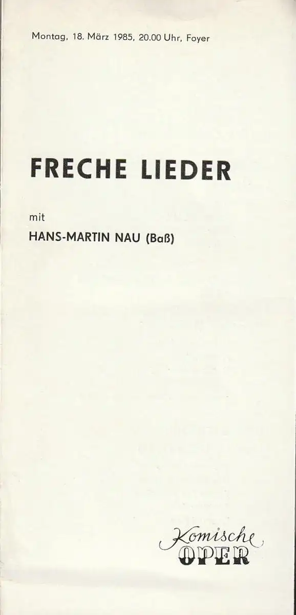 Komische Oper Berlin: Programmheft FRECHE LIEDER MIT HANS-MARTIN NAU 18. März 1985.